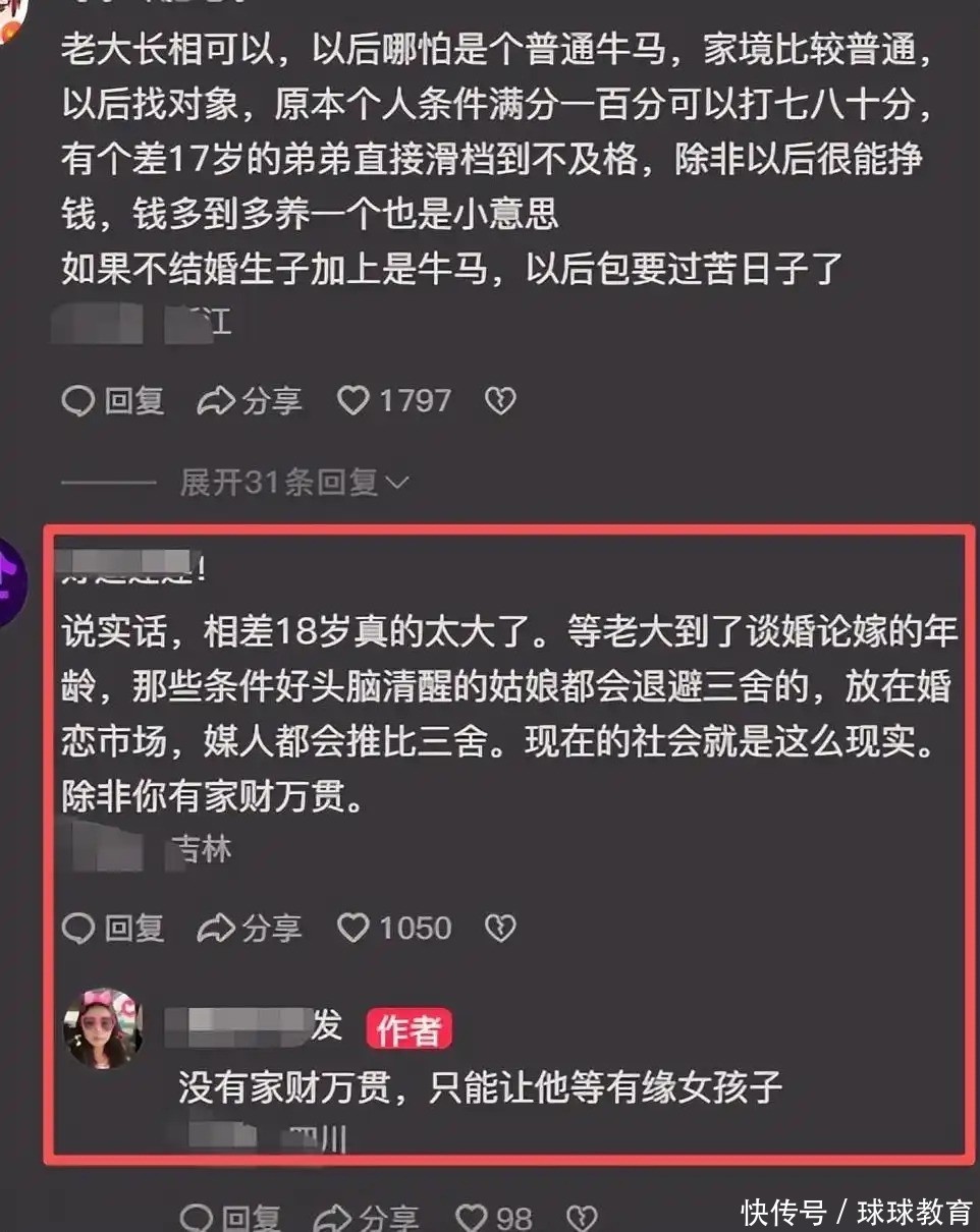而这位家长在看到了评论区这么多大实话后,表面上不动声色,实则内心已经破防了,否则她也不会说出那句——“没有家财万贯,只能让他等有缘的女孩子”了。