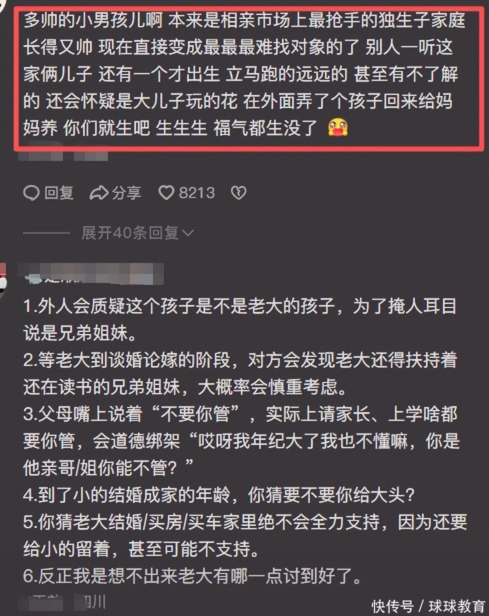 就连互联网上都有不少人调侃“大号练废了开小号”,他难道就不会怀疑:家长是否不打算管自己了,才在自己18岁这年要了二胎呢?等到老大高考进入大学后,别的家长都在为孩子谋划未来,而你们却要为老二的吃喝拉撒吵翻天,这样的家庭教育,着实难评。